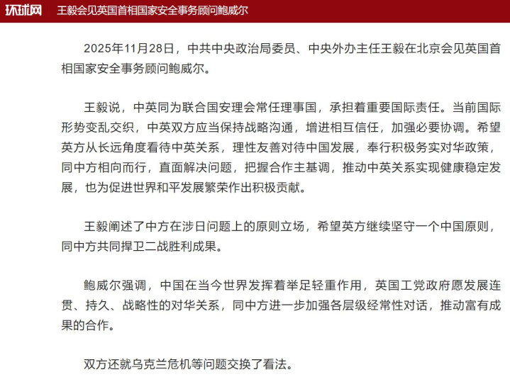 据环球网报道,日前王毅外长在北京会见英国首相国安顾问鲍威尔。